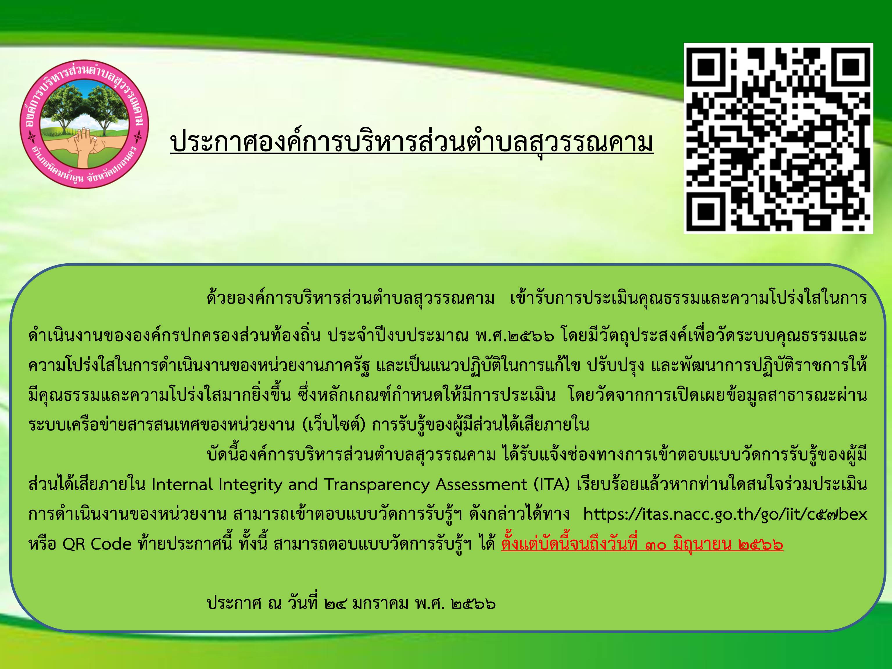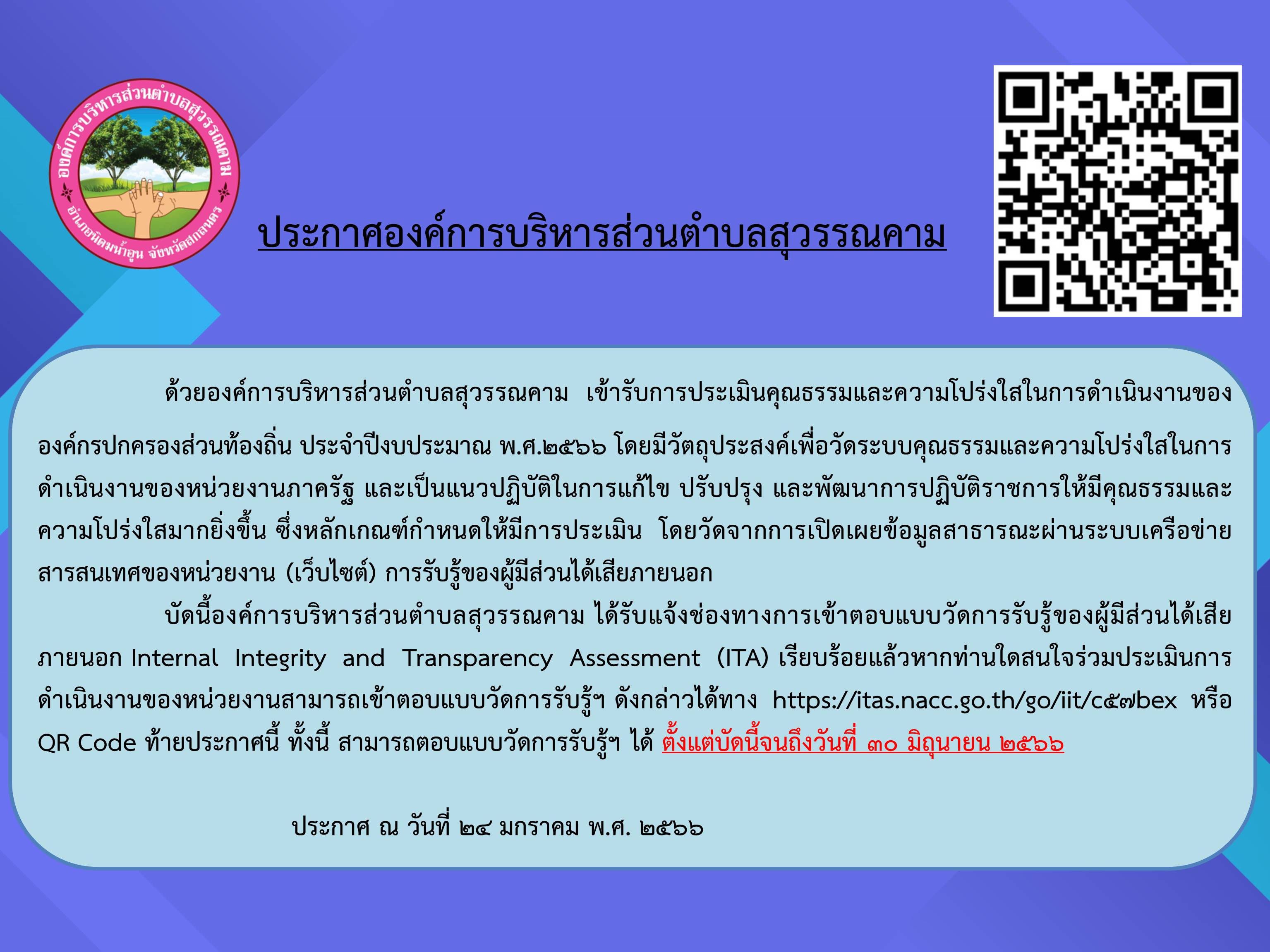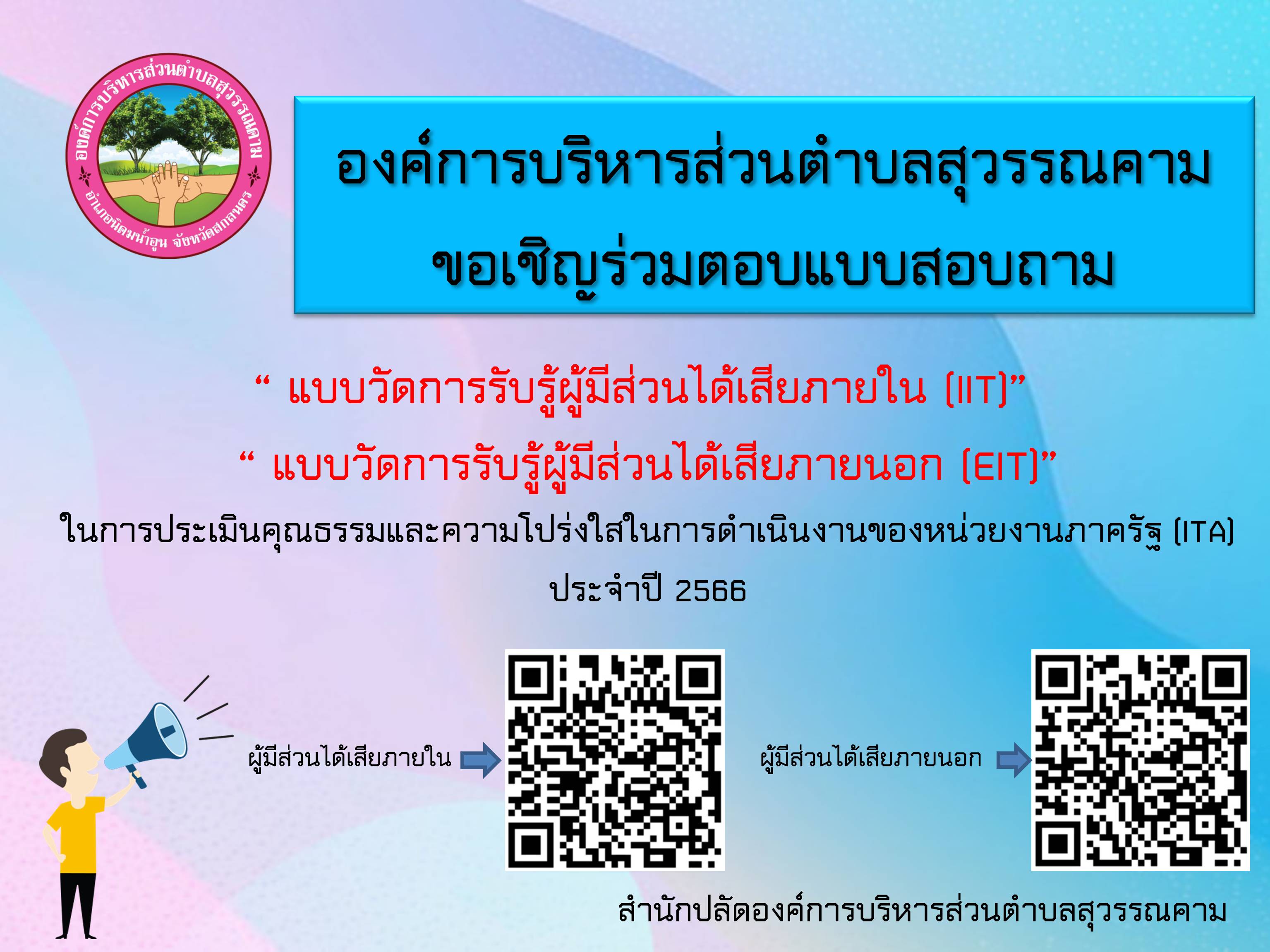 ประชาสัมพันธ์เชิญชวนร่วมแสดงความคิดเห็นในการประเมินคุณธรรมและความโปร่งใสในการดำเนินงานขององค์การบริหารส่วนตำบลสุวรรณคาม ประจำปี 2566