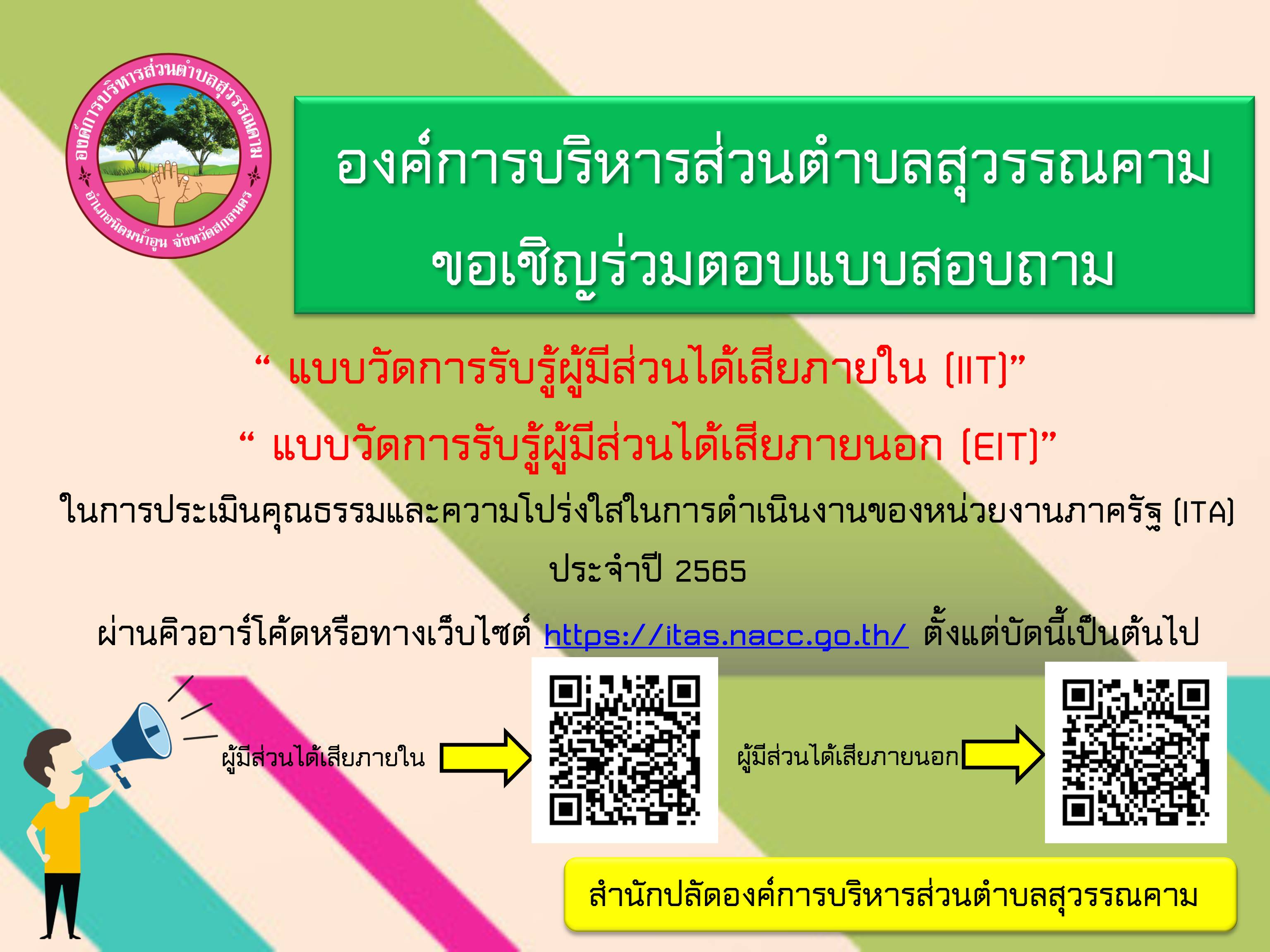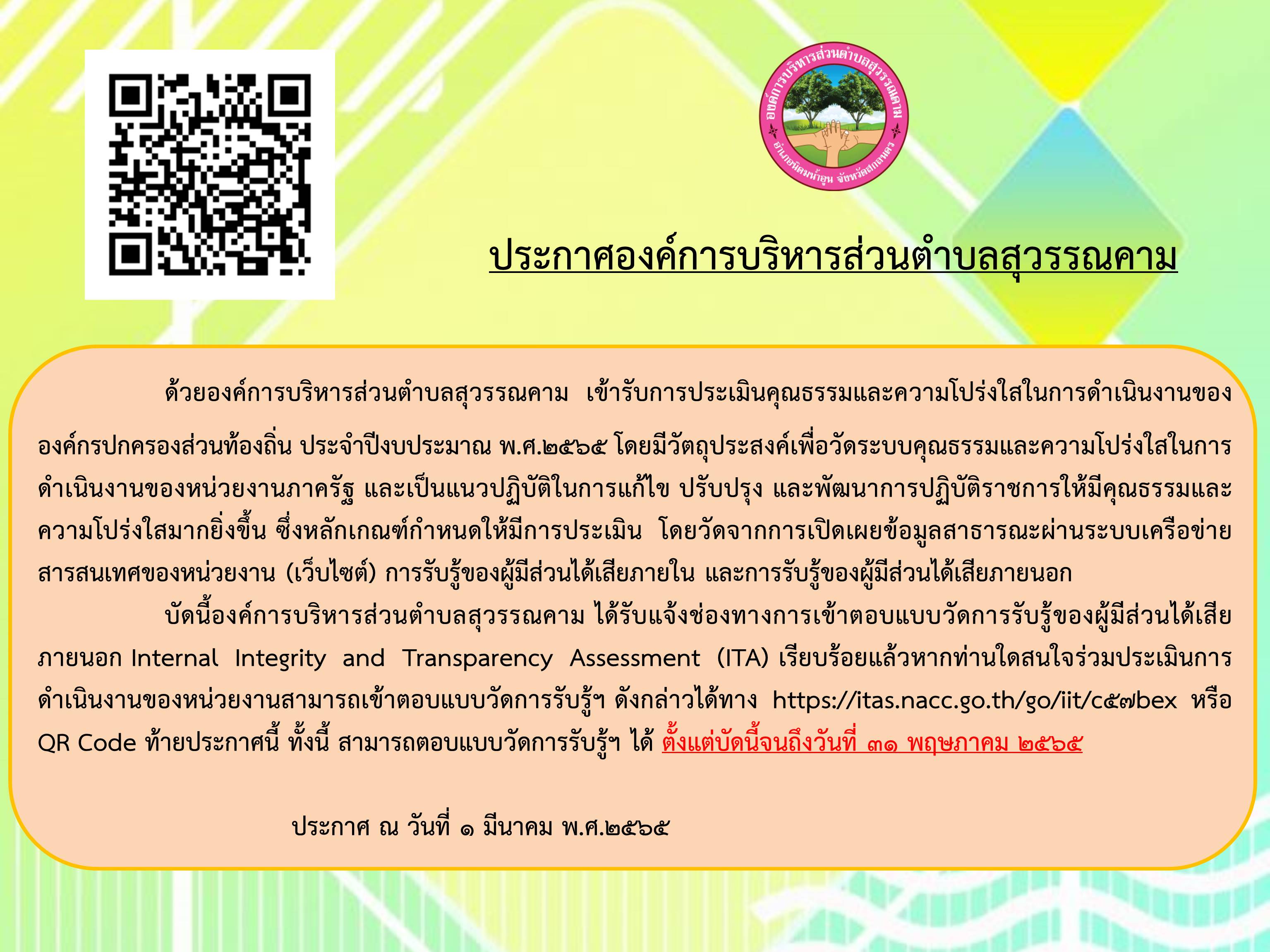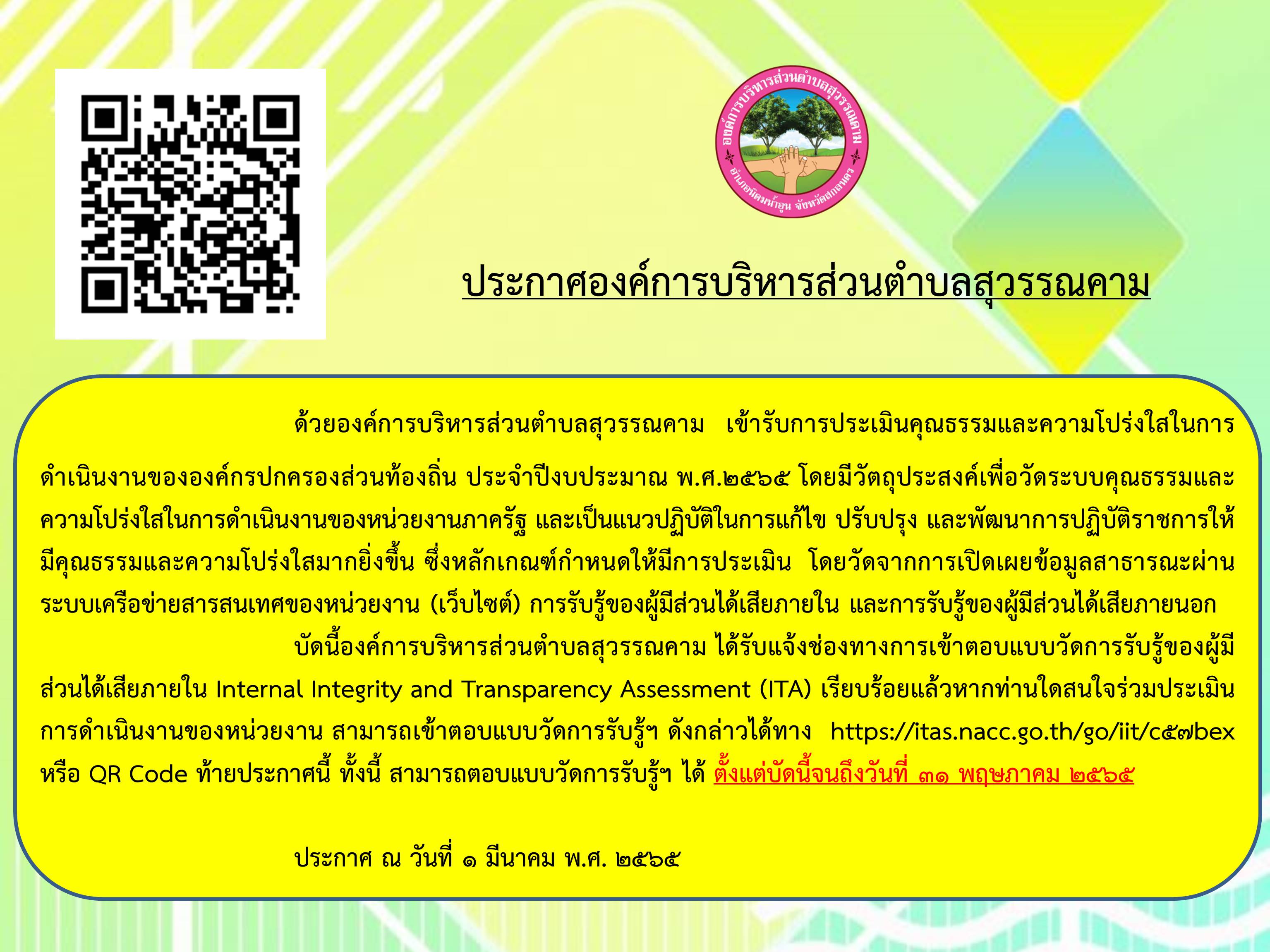 ประชาสัมพันธ์เชิญชวนร่วมแสดงความคิดเห็นในการประเมินคุณธรรมและความโปร่งใสในการดำเนินงานขององค์การบริหารส่วนตำบลสุวรรณคาม ประจำปี 2565