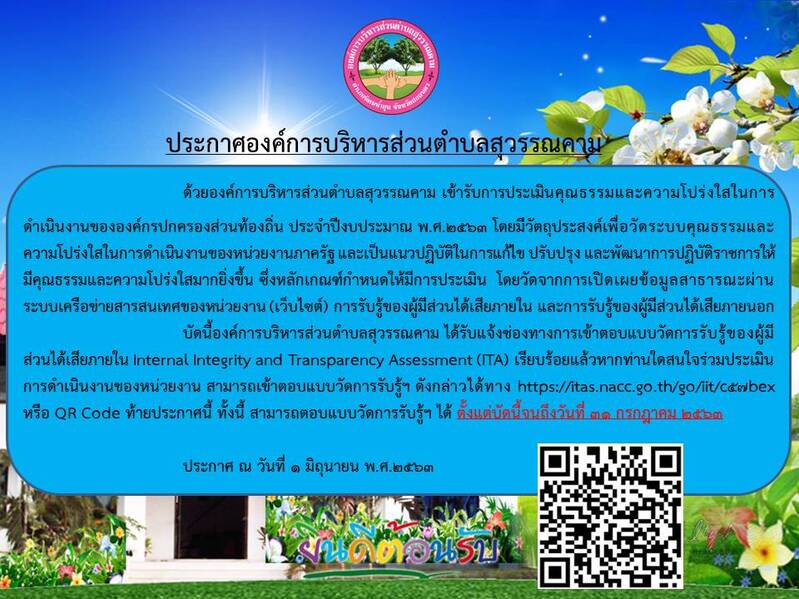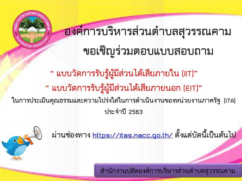 ประชาสัมพันธ์เชิญชวนร่วมแสดงความคิดเห็นในการประเมินคุณธรรมและความโปร่งใสในการดำเนินงานขององค์การบริหารส่วนตำบลสุวรรณคาม ประจำปี 2563