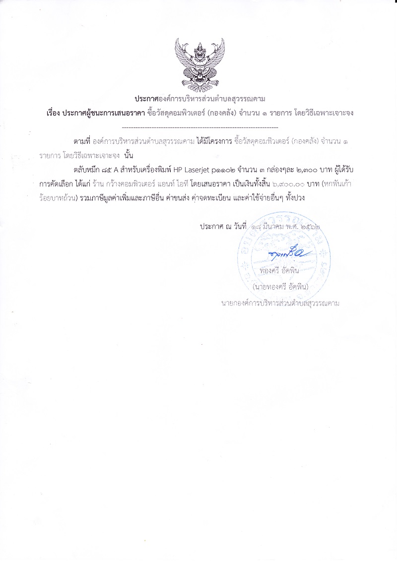ประกาศผู้ชนะการเสนอราคา ซื้อวัสดุคอมพิวเตอร์ (กองคลัง)