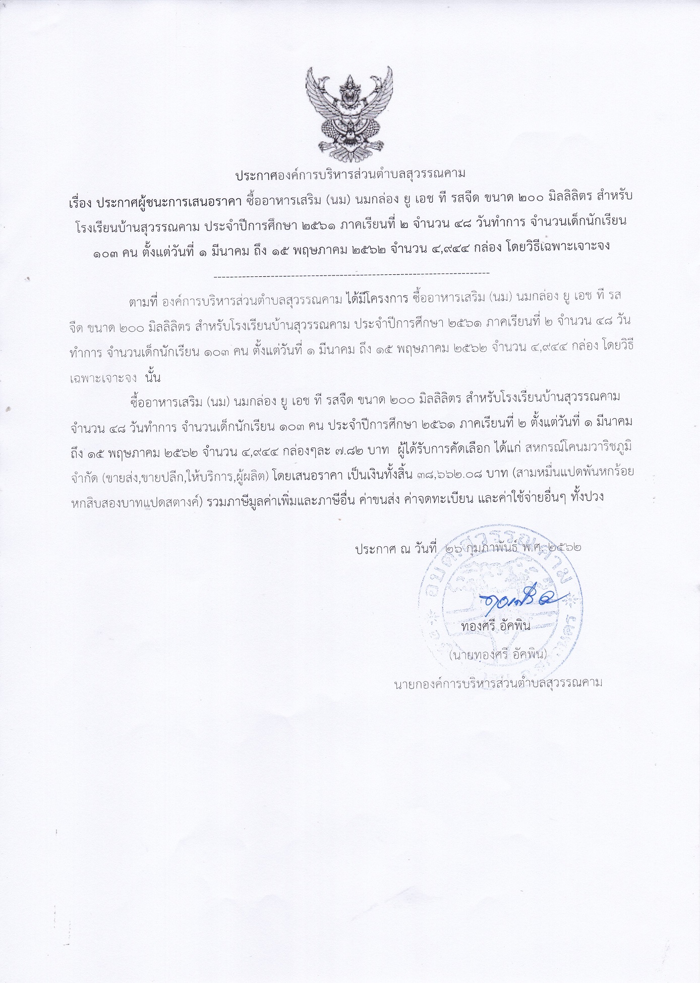 ประกาศผู้ชนะการเสนอราคา ซื้ออาหารเสริม (นม) สำหรับโรงเรียนบ้านสุวรรณคาม