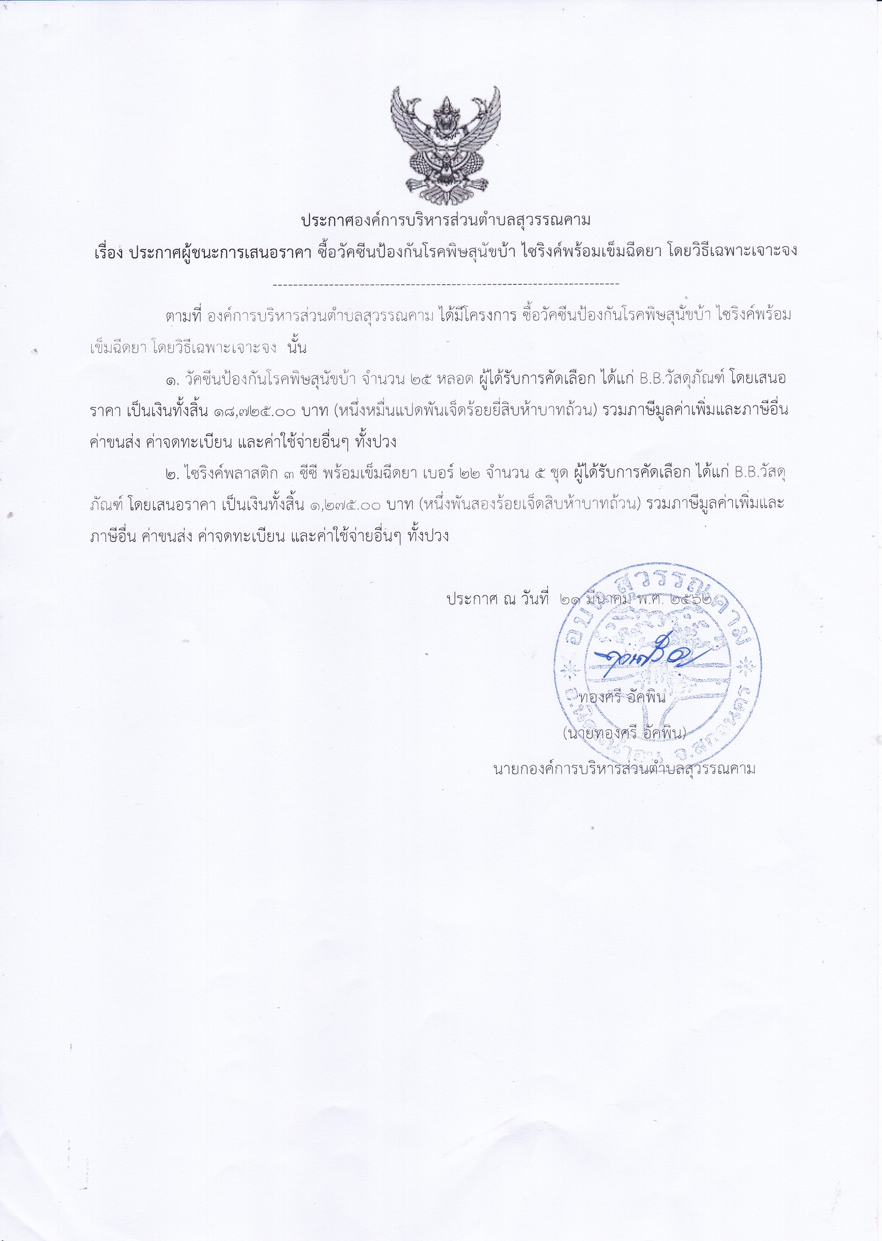 ประกาศผู้ชนะการเสนอราคา ซื้อวัคซีนป้องกันโรคพิษสุนัขบ้า