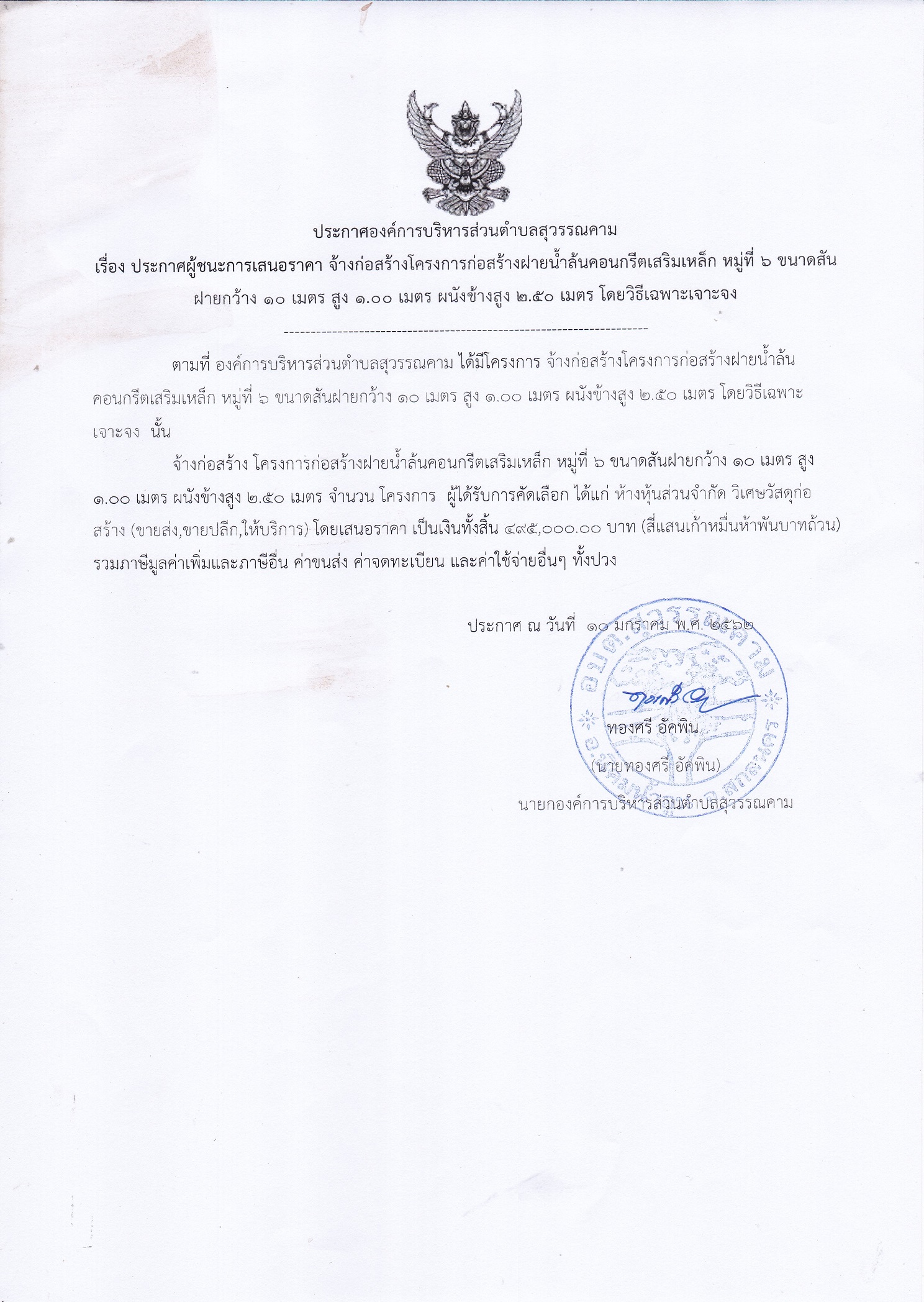 ประกาศผู้ชนะเสนอรา จ้างก่อสร้างโครงการก่อสร้างฝายน้ำล้น หมู่ที่ 6