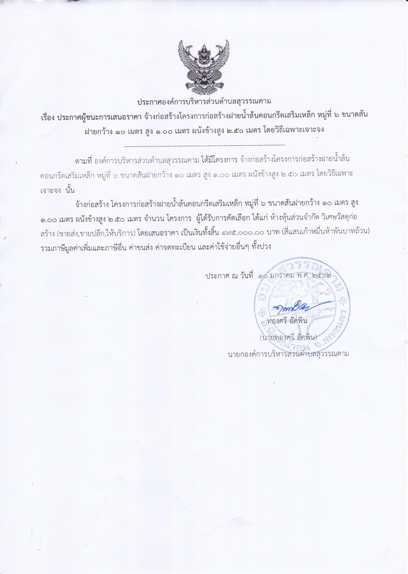ประกาศผู้ชนะการเสนอราคาจ้างก่อสร้างโครงการก่อสร้างฝายน้ำล้นคอนกรีตเสริมเหล็ก หมู่ 6