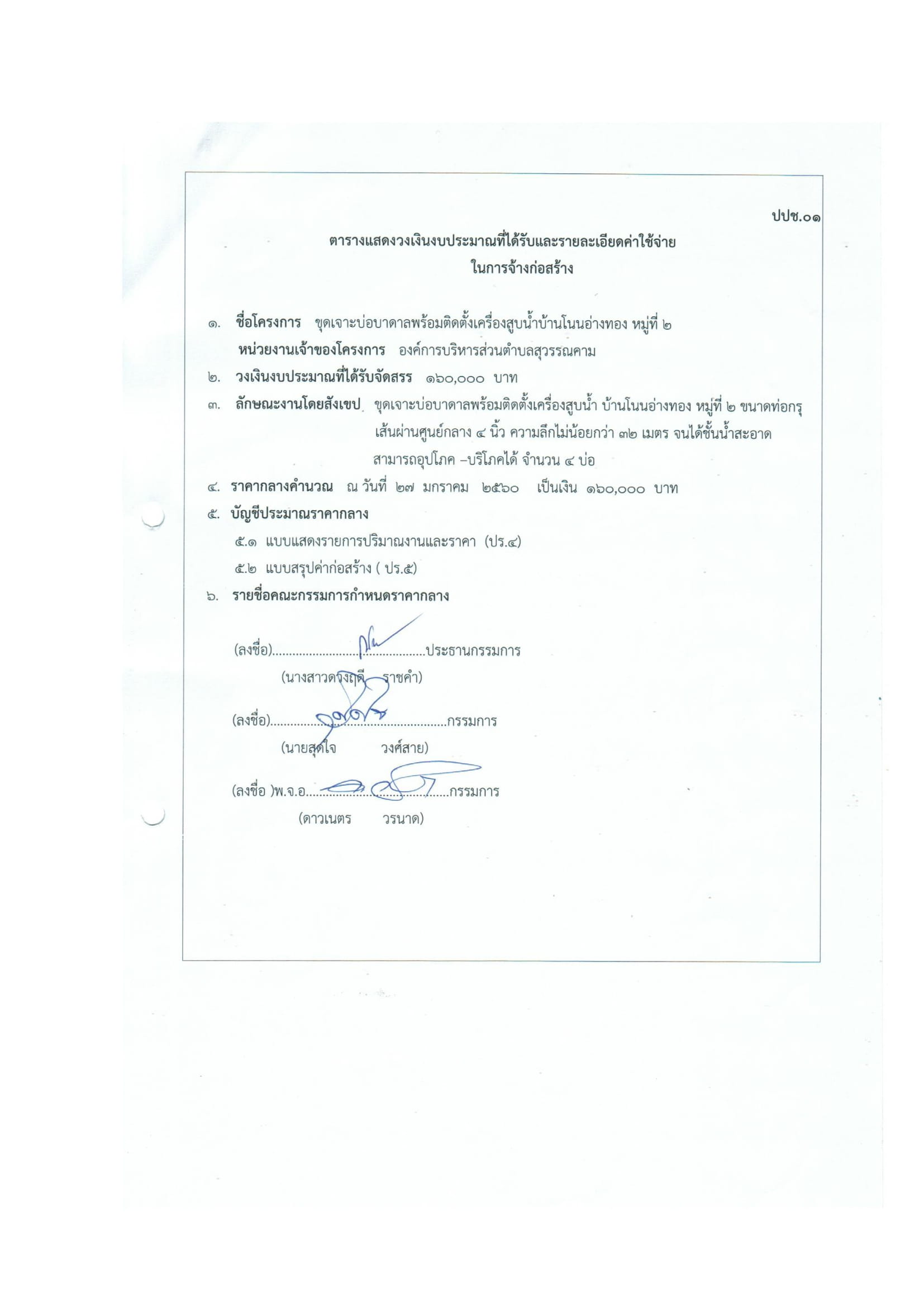 ตารางแสดงวงเงินงบประมาณโครงการขุดเจาะบ่อบาดาลพร้อมติดตั้งเครื่องสูบน้ำ บ้านโนนอ่างทอง หมู่ที่ 2 ปีงบประมาณ 2560