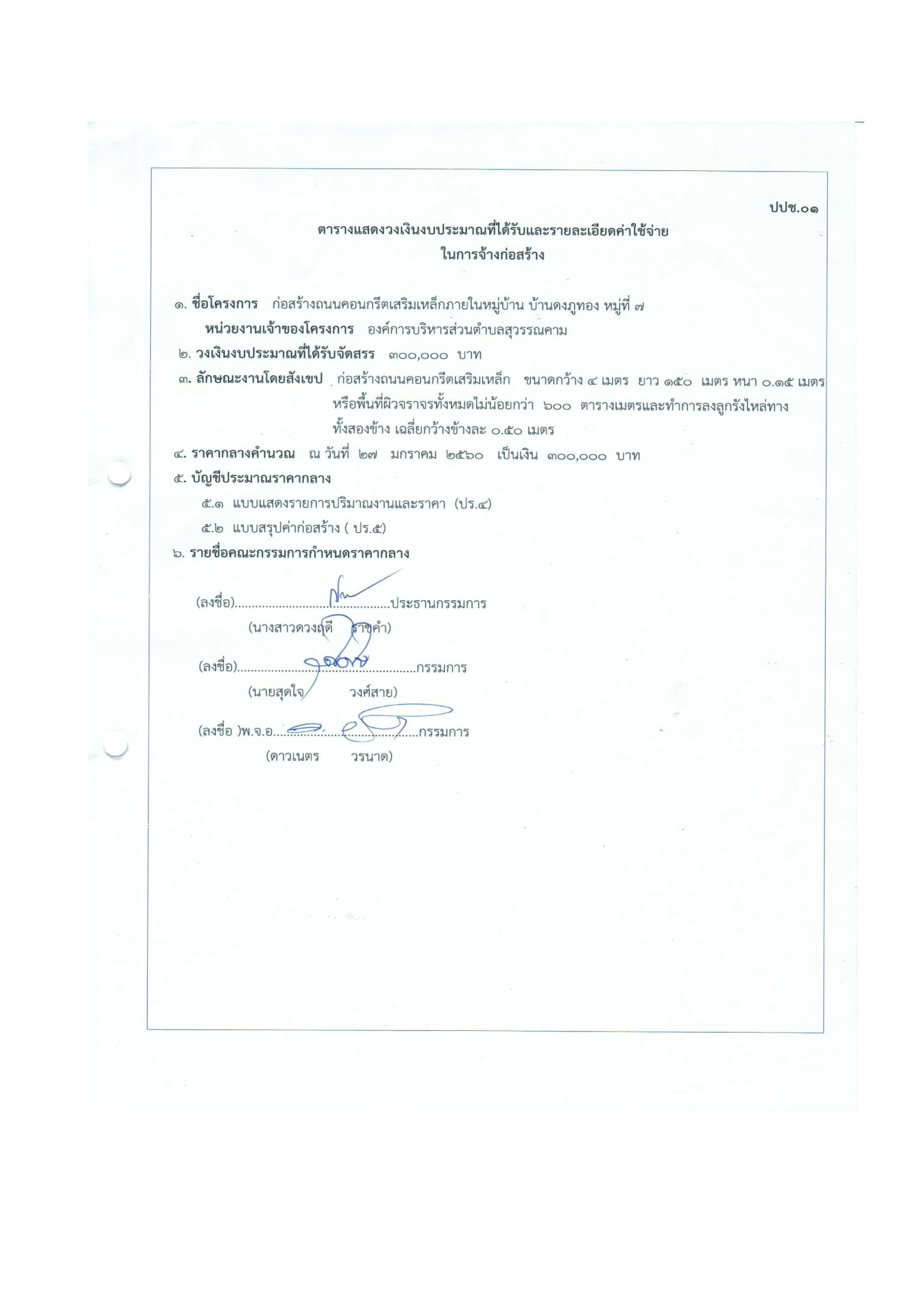 ตารางแสดงวงเงินงบประมาณโครงการก่อสร้างถนนคอนกรีตเสริมเหล็กภายในหมู่บ้าน บ้านดงภูทอง หมู่ที่ 7 ปีงบประมาณ 2560