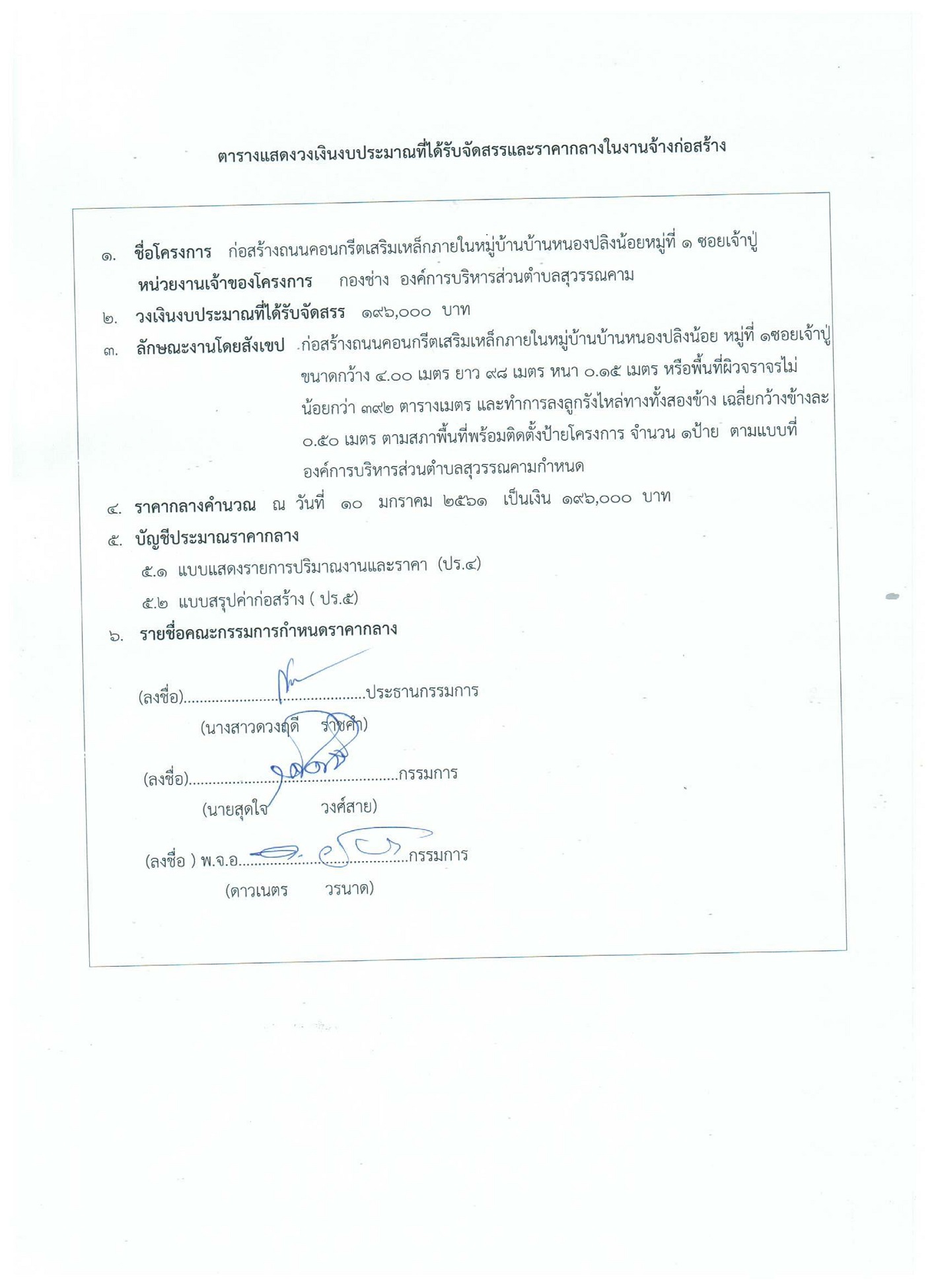โครงการก่อสร้างถนนคอนกรีตเสริมเหล็กภายในหมู่บ้านหนองปลิงน้อย หมู่ที่ 1 (ซอยศาลเจ้าปู่)