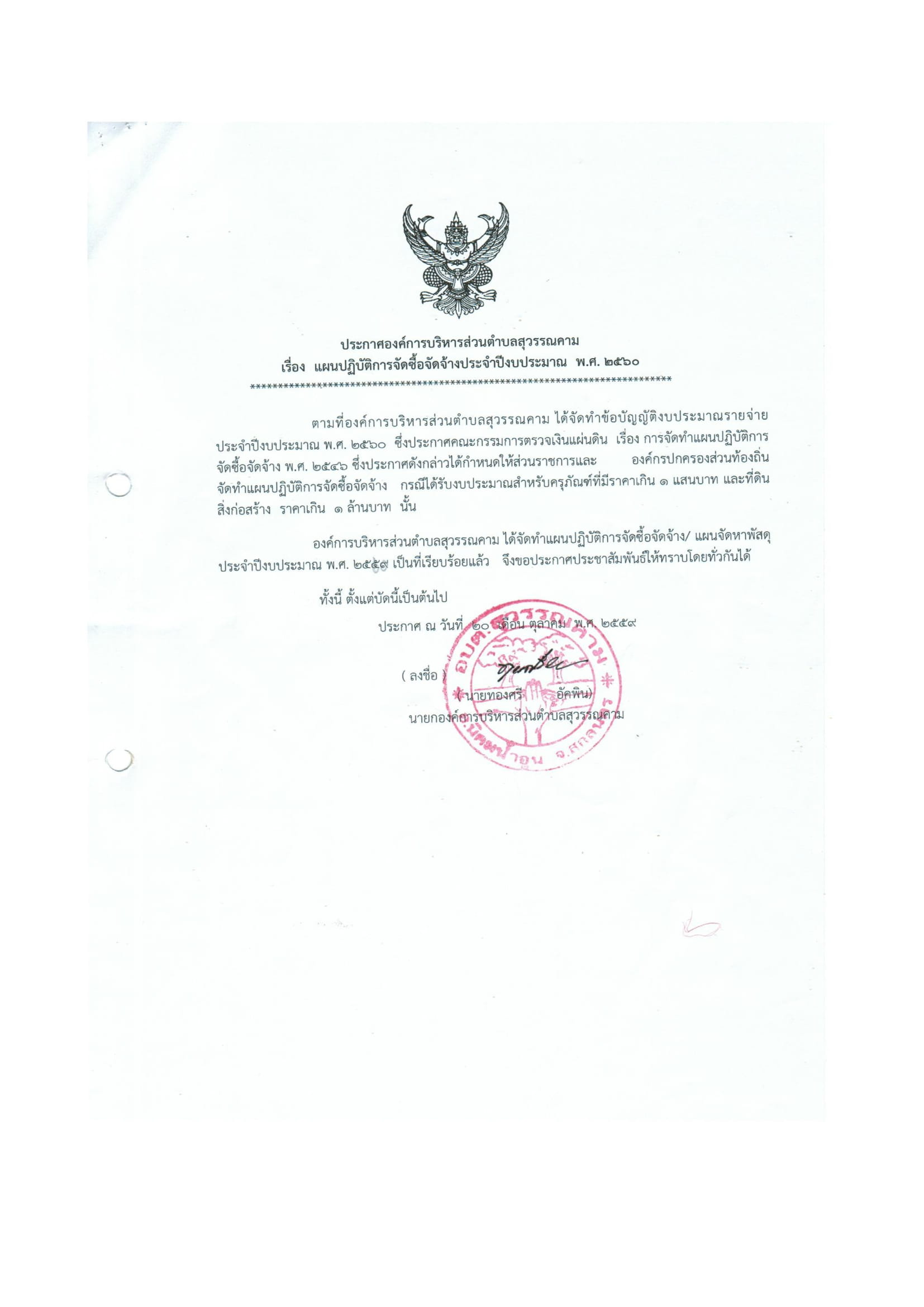 ประกาศแผนปฏิบัติการจัดซื้อจัดจ้าง ปีงบประมาณ 2560