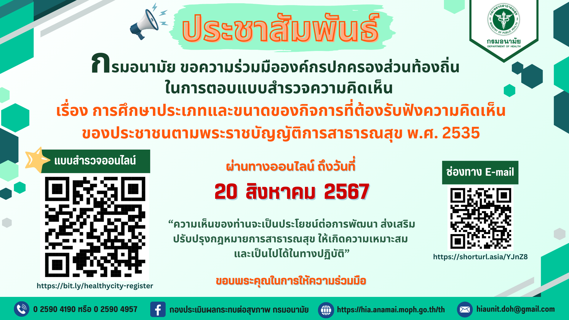 ประชาสัมพันธ์กรมอนามัยขอความร่วมมือตอบแบบสอบถามเรื่องการศึกษาประเภทและขนาดของกิจการที่ต้องรับฟังความคิดเห็นของประชาชนตามพระราชบัญญัติการสาธารณสุข พ.ศ. 2535